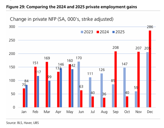 瑞银集团预测,6月非农就业人数将仅增加10万人,远低于前四个月平均12.7万人的增速。其中,私人部门预计增加9.5万人,政府部门增加0.5万人。值得注意的是,联邦政府就业预计减少1万人,主要受人员自然流失影响。