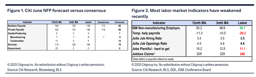“我认为市场触发‘增长恐慌’交易的门槛是非农就业人数低于6万,尤其是如果利率市场并未因此迫使美联储在7月更快行动(届时需等到9月才有下一次FOMC会议——我们仍记得美联储7月按兵不动后,疲软数据引发的增长恐慌行情)。”