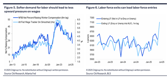 在薪资增长方面,花旗预计6月平均时薪环比增幅将从5月的0.4%进一步放缓至0.2%。这部分可能反映了在5月表现特别疲软的信息和贸易服务等部门工作时间的反弹。劳动力需求疲软对薪资增长的下行影响预计将超过劳动力供给减少的上行压力。来自全国独立企业联合会调查等薪资增长趋势的领先指标表明,今年整体薪资将进一步放缓。